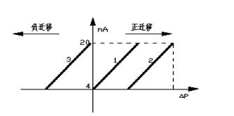 差壓變送器的零點(diǎn)遷移量分為正遷移與負(fù)遷移,在液位零點(diǎn)位置,當(dāng)正負(fù)壓室之間的壓差值P>0時(shí),為正遷移;P<0時(shí),為負(fù)遷移;P=0時(shí),無遷移。差壓變送器正負(fù)遷移特性曲線表示如下,見圖3:
