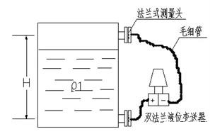 法蘭式液位變送器的測量原理與差壓式液位變送器基本相同,遷移量和量程也可以通過上述的公式計(jì)算得出,在此不再列出。計(jì)算遷移量時(shí)不需考慮差壓變送器的安裝位置,只要考慮法蘭式液位變送器毛細(xì)管內(nèi)所充硅油的密度和兩個(gè)法蘭中心高度差,見圖7示意圖。