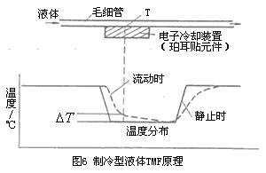 液體用tmf 在20世紀(jì)90年代初中期開始發(fā)展并在工業(yè)生產(chǎn)中應(yīng)用,但當(dāng)前主要為微小流量?jī)x表。有消耗功率測(cè)量法的熱分布式tmf和利用珀?duì)柼? peltier)致冷元件在檢測(cè)部位致冷(即附加熱)的tmf。后者的測(cè)量原理如圖6所示,流量傳感器由測(cè)量毛細(xì)管、電子冷卻裝置(珀?duì)柼?和3各溫度檢出件組成。測(cè)量管和致冷元件接觸,無液體流動(dòng)時(shí)冷卻到某一溫度時(shí),兩者溫度相等;液體流動(dòng)時(shí)致冷元件附近測(cè)量毛細(xì)管溫度上升,如虛線所示分布,測(cè)量溫度檢測(cè)點(diǎn)的兩者溫度差以求的流量。