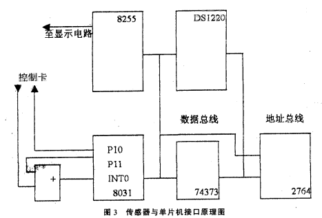 圖3中,單片機(jī)8031、74373和2764組成單片機(jī)核心電路,8255為顯示電路接口,DSl220為不揮發(fā)RAM,用其存儲(chǔ)流量可保證斷電后流量不丟失。工作時(shí)8031每隔一個(gè)采樣周期先啟動(dòng)定時(shí)器T1,然后通過(guò)PIO引腳向控制卡發(fā)控制信號(hào),換能器發(fā)一聲波經(jīng)被測(cè)污水反射由換能器接收,控制卡的邏輯輸出端輸出一脈沖,脈沖信號(hào)經(jīng)過(guò)或門(mén)進(jìn)入INTO腳,引起中斷請(qǐng)求。在中斷服務(wù)程序中從定時(shí)器中取出定時(shí)值,計(jì)算出對(duì)應(yīng)的液位。由于傳感器在發(fā)出聲波后,在4MS以?xún)?nèi)會(huì)產(chǎn)生無(wú)用的盲區(qū)脈沖,所以在P10向控制卡發(fā)控制脈沖的同時(shí),通過(guò)P11引腳發(fā)一個(gè)4ms的高電平封鎖信號(hào),防止“盲區(qū)脈沖”通過(guò)或門(mén)進(jìn)入INTO引腳。