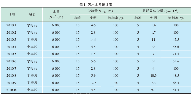 以一礦為例,2010年1~10月寧海污水站累計(jì)處理污水187萬m,日均6200m。,110月份外輸污水含油累計(jì)達(dá)標(biāo)率100%,外輸懸浮物累計(jì)達(dá)標(biāo)率69.7%(見表1)。