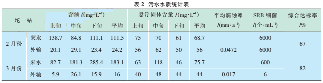 2011年2月坨一站來水含油平均183.1mg/L,外輸含油平均16mg/L,懸浮固體平均8.3mg/L,平均腐蝕率0.017m1m/a,SRB細(xì)菌平均6個/mL。只有懸浮固體含址超標(biāo)。