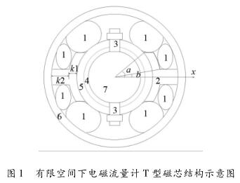 T型磁芯是為較小的空間下實(shí)現(xiàn)盡可能大的勵磁線圈而提出的,如圖1所示為較小空間結(jié)構(gòu)下,設(shè)計有T型磁芯的井水流量計傳感器截面圖。在圖中1表示線圈位置;2表示磁芯位置;3表示電極及其固定器件位置;4表示襯里位置;5表示內(nèi)徑壁位置;6表示外徑壁;7表示測量管道(測量區(qū)域)。如圖1所示井水流量計勵磁結(jié)構(gòu)磁芯造型近似為T型(因稱為T型磁芯),磁芯在靠近井水流量計內(nèi)管道時為T型磁芯的較長端。如圖中所示,T型磁芯較長端與x軸夾角為a,T型磁芯較短端與x軸夾角為b,T型磁芯較長端寬度為k1,T型磁芯較短端寬度為k2。