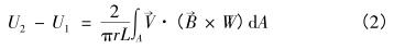 式中,U2-U1是兩電極的電勢差;A表示對所有空間積分;L為絕緣管道筒長一半;r為流量計截面管半徑;矢量珗B是導(dǎo)電流體的流速;B是磁感應(yīng)強(qiáng)度;W為矢量權(quán)重函數(shù),它是一個只由井水流量計本身結(jié)構(gòu)決定的量。由(2)式可知,只要確定了流體的流速V、磁感應(yīng)強(qiáng)度B、以及權(quán)重函數(shù)W,以及流量計管徑半徑,就可以求流量計的感應(yīng)電勢差。
