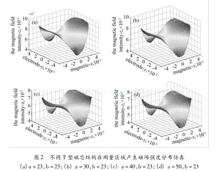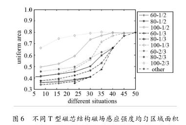 仿真實(shí)驗(yàn)證明在有限的空間下,修改T磁芯的不同參數(shù),可以增加流量計測量區(qū)域內(nèi)部的磁場分布情況,也可以適當(dāng)?shù)恼{(diào)整流量計測量區(qū)域中的磁場強(qiáng)度與均勻度,根據(jù)生產(chǎn)測井中的實(shí)際工況,改變井水流量計的T磁芯參數(shù)獲得設(shè)計參數(shù)。