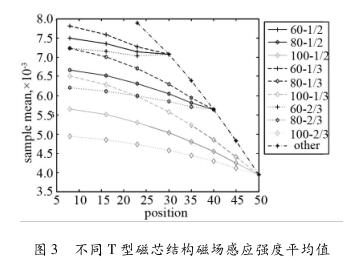 如圖3所示為不同T型磁芯結(jié)構(gòu)下測量區(qū)域產(chǎn)生磁場感應(yīng)強(qiáng)度平均值,圖中橫坐標(biāo)為T型磁芯b的角度,縱坐標(biāo)為測量區(qū)域的平均磁場強(qiáng)度,圖標(biāo)表示的是T型磁芯的不同a的角度以及磁芯長端寬度所占的比例。其中以“角度-比例”表示,例如30-1/2表示T型磁芯的較長端角度a為30°,k1/(k1+k2)為1/2時的測量區(qū)域中平均磁場強(qiáng)度測量結(jié)果。圖標(biāo)Other為T型磁芯較長端的角度a與較短端的角度b相等(即為23,30,35,40,45,50)時的流量計測量區(qū)域中的平均磁場強(qiáng)度。從仿真結(jié)果可以看出:T型磁芯的較長端的角度a越小,流量計測量區(qū)域中平均磁場強(qiáng)度越大;在T型磁芯的較長端的角度a一定時,T型磁芯的較短端的角度b越小,流量計測量區(qū)域中平均磁場強(qiáng)度越大;在T型磁芯的較長端的角度a與較短端的角度b一定時,T型磁芯的k1/(k1 + k2)越小,在流量計測量區(qū)域中平均磁場強(qiáng)度越大。