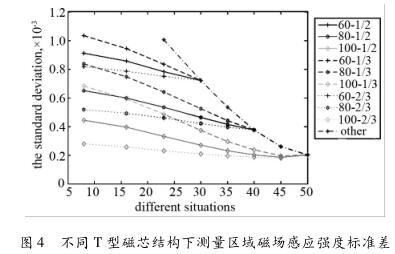 如圖4所示為不同T型磁芯結(jié)構(gòu)下測量區(qū)域產(chǎn)生磁場感應(yīng)強(qiáng)度標(biāo)準(zhǔn)差,圖中橫坐標(biāo)為T型磁芯b的角度,縱坐標(biāo)為測量區(qū)域磁場強(qiáng)度的標(biāo)準(zhǔn)差,圖標(biāo)圖例與圖3中一致。從仿真結(jié)果可以看出:T型磁芯的較長端的角度a越小,流量計測量區(qū)域中磁場強(qiáng)度標(biāo)準(zhǔn)差越大;在T型磁芯的較長端的角度a一定時,T型磁芯的較短端的角度b越小,流量計測量區(qū)域中磁場強(qiáng)度標(biāo)準(zhǔn)差越大;在T型磁芯的較長端的角度a與較短端的角度b一定時,T型磁芯的k1/(k1 + k2)越小,在流量計測量區(qū)域中磁場強(qiáng)度標(biāo)準(zhǔn)差越大。