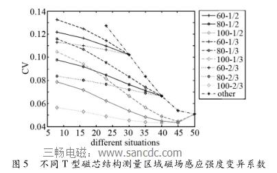 標(biāo)準(zhǔn)差代表磁場測量區(qū)域的磁場分布波動性較大,因而需引入變異系數(shù)對測量區(qū)域中的磁場分布情況進(jìn)一步分析。如圖5所示為不同T型磁芯結(jié)構(gòu)下測量區(qū)域磁場感應(yīng)強(qiáng)度變異系數(shù),圖中橫坐標(biāo)為T型磁芯b的角度,縱坐標(biāo)為測量區(qū)域磁場強(qiáng)度分布的變異系數(shù),圖標(biāo)圖例與圖3中一致。從仿真結(jié)果可以看出:T型磁芯的較長端的角度a越小,流量計測量區(qū)域中磁場強(qiáng)度變異系數(shù)越大;在T型磁芯的較長端的角度a一定時,T型磁芯的較短端的角度b越小,流量計測量區(qū)域中磁場強(qiáng)度變異系數(shù)越大;在T型磁芯的較長端的角度a與較短端的角度b一定時,T型磁芯的k1/(k1 + k2)越小,在流量計測量區(qū)域中磁場強(qiáng)度變異系數(shù)越大。異系數(shù)越大說明磁場分布越不均勻,波動性越大;異系數(shù)越小說明磁場分布趨向均勻。下面通過計算測量區(qū)域中的磁場均勻區(qū)域來對這一結(jié)果進(jìn)一步的分析。