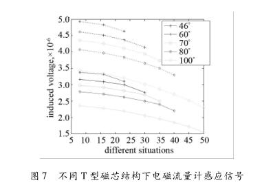 從仿真結(jié)果可以看出:T型磁芯的較長端的角度a越小,流量計電極兩端獲得的感應(yīng)信號越大;在T型磁芯的較長端的角度a一定時,T型磁芯的較短端的角度b越小,流量計電極兩端獲得的感應(yīng)信號越大。這主要是因?yàn)?strong>井水流量計勵磁線圈的增加,使得流量計測量區(qū)域的磁場強(qiáng)度增加,同樣分布的流速下使得流量計電極兩端的感應(yīng)信號增加。