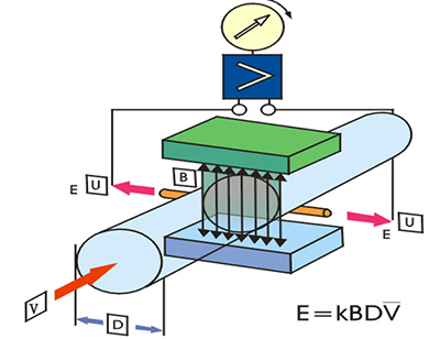 式中k, D為常數(shù),由于勵(lì)磁電流是恒流,故B也是常數(shù),則由E=KBdV可知,體積流量Q與信號(hào)電壓E成正比,即流速感應(yīng)的信號(hào)電壓E與體積Q成線性關(guān)系。因此,只要測(cè)量出E就可確定流量Q,這是電磁流量計(jì)的基本工作原理。